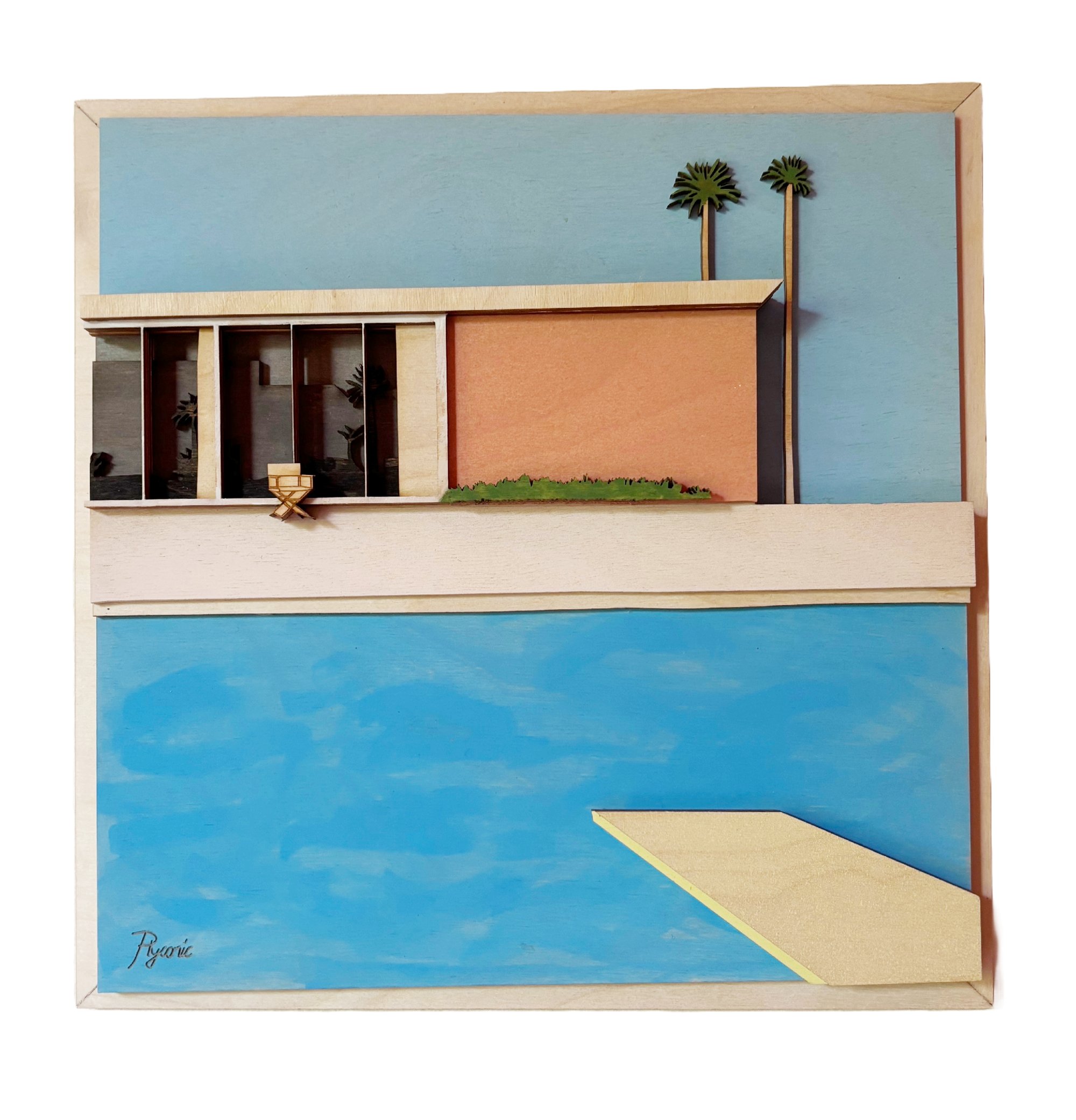 Mini 3d relief of a David Hockney inspired painting. The plywood layers add depth and shadows to the piece, with glimmers of ply grain showing through to add pattern and warmth.